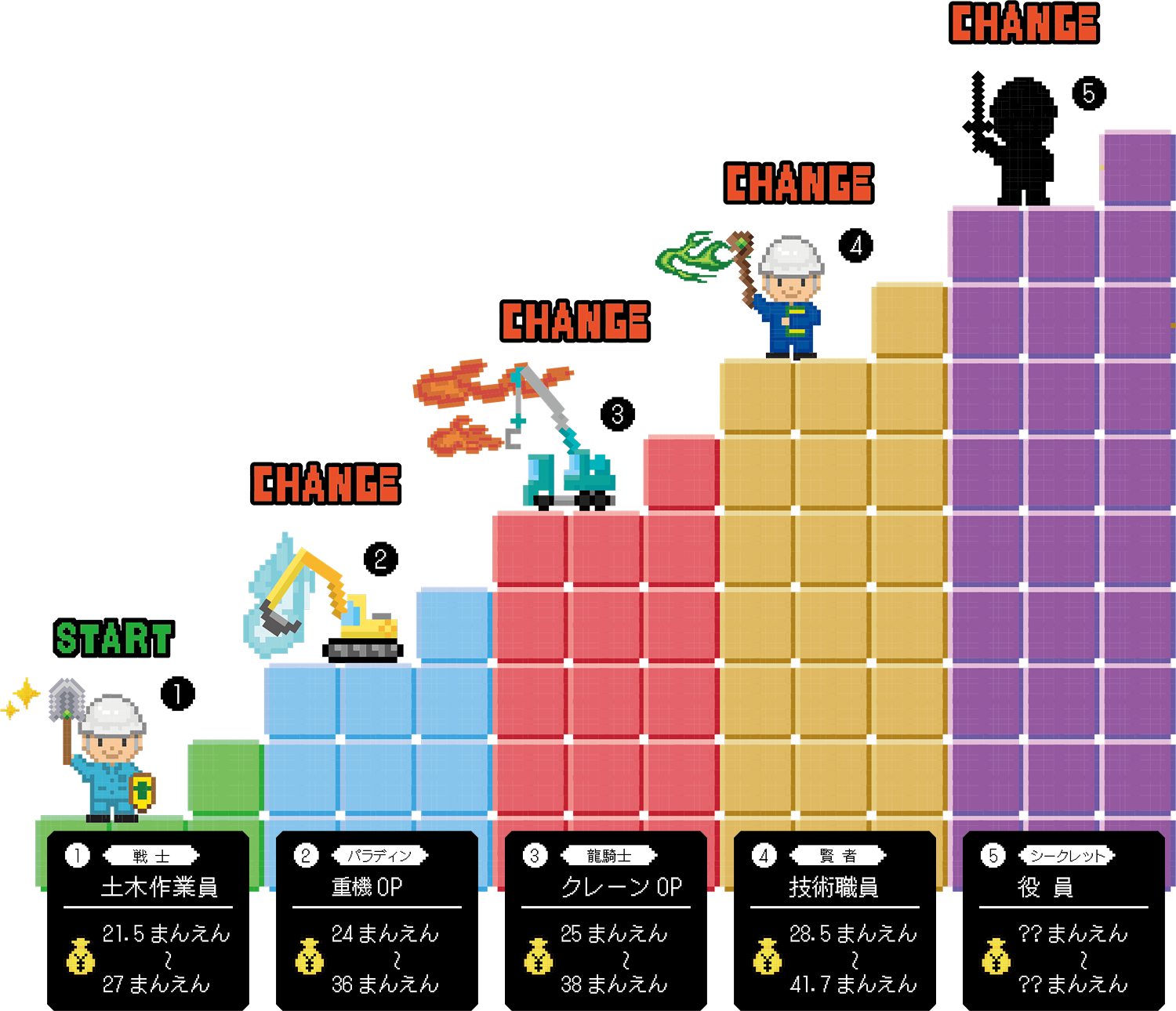 土木作業を入口に、重機やクレーンの操作、現場管理など、希望や適性に応じて別の職種にステップアップすることができます。資格取得も会社が支援し、取得した資格やスキルに応じて、しっかり給与にも反映されていきます。